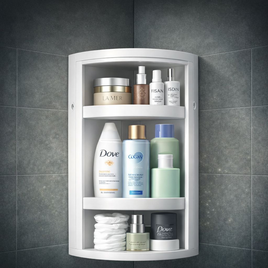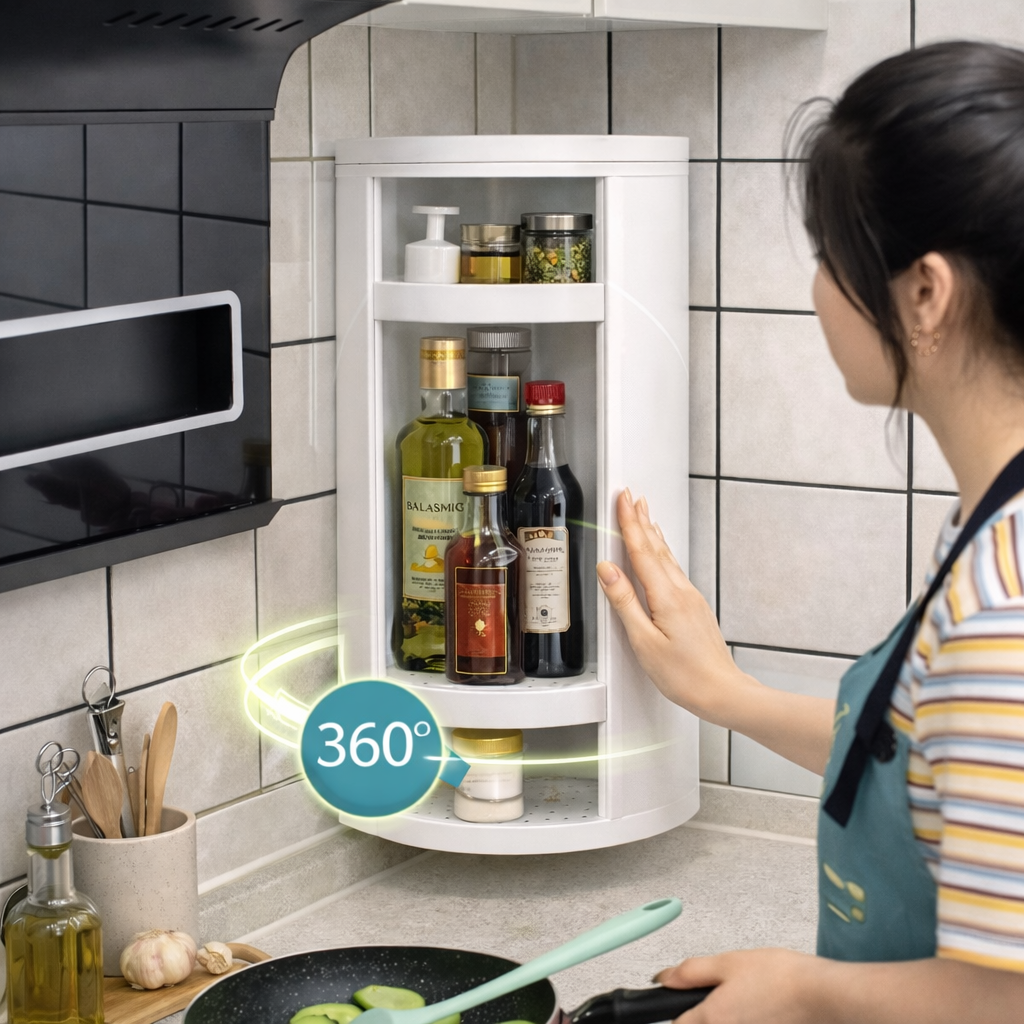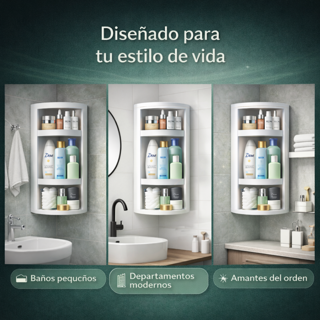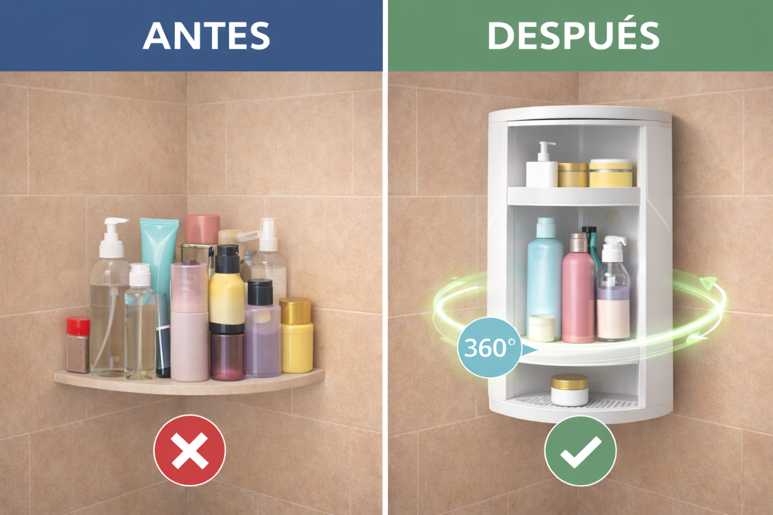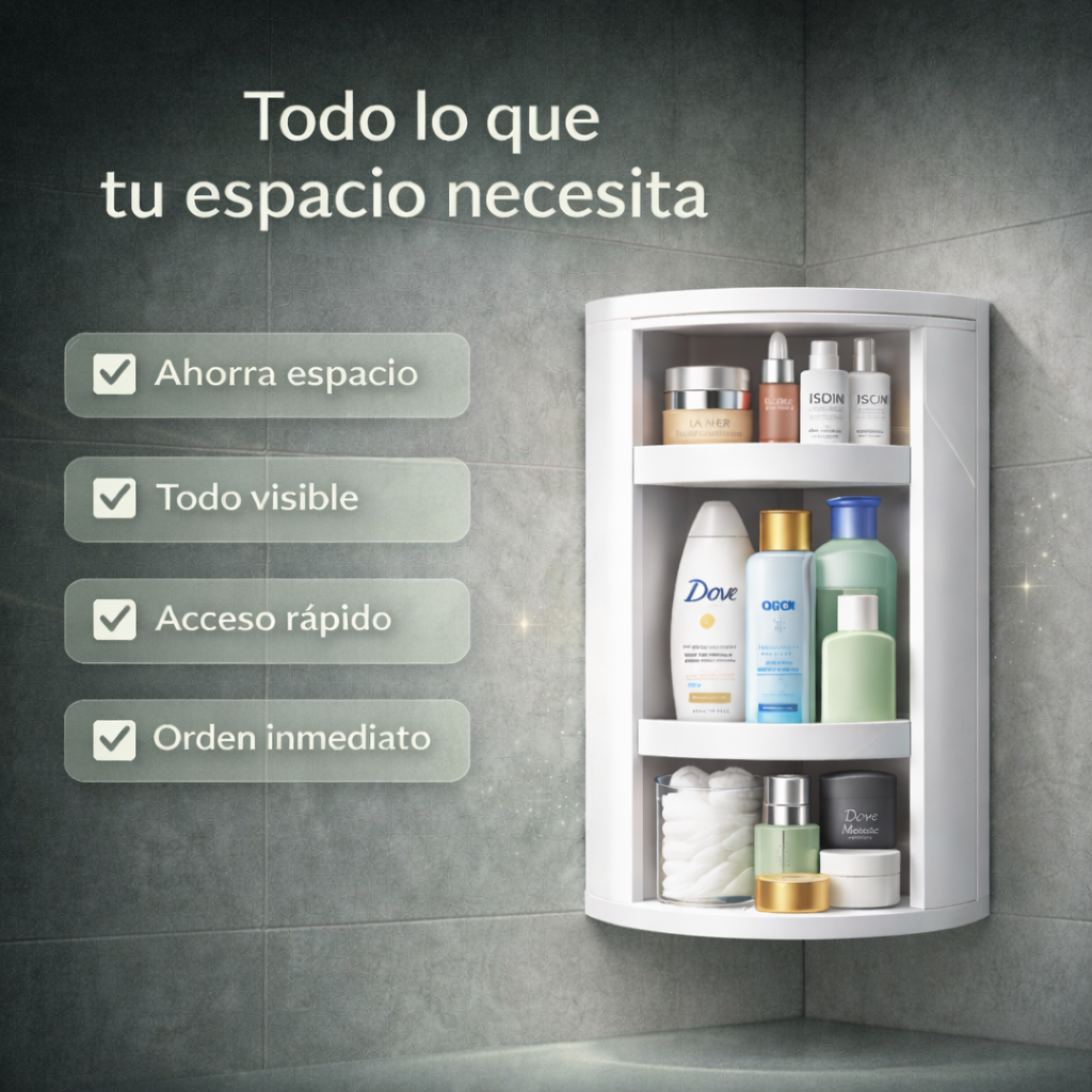 Optimiza el espacio de tu hogar con nuestro Organizador Esquinero Giratorio de 3 Niveles 360°. Una solución inteligente para mantener ordenados y accesibles tus artículos en el baño, la cocina o el dormitorio.